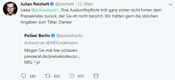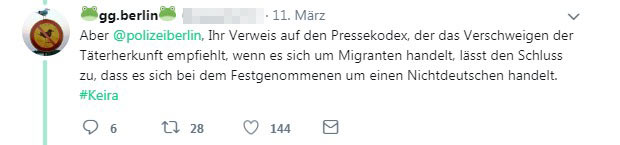 Schweigen, das sagt Twitter auch deutlich, das könne man klar interpretieren. Also nicht in dem Sinne, dass Polizei ihre Arbeit macht, sondern etwas andeuten will.