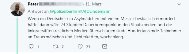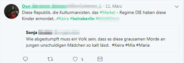 Um das Opfer, um die Trauer ihrer Angehörigen oder Gerechtigkeit geht es deutlich schon lange nicht mehr, dafür aber um Hass aller Art gegen die Regierung, Migranten und Geflüchtete. Auch deshalb ist egal, was die Ermittlungen schlussendlich ergeben: dieser Mord – wie auch der Mord in Kandel – ist für Rassist_innen und Rechtpopulist_innen nur ein Ventil, um ihren Hass zu ergießen. Und ihre „Lösung“ anzubieten: Grenzen zu, Asylsuchende sterben lassen, und denken, wenn dann nicht alles besser wird, suchen wir uns die nächsten Schuldigen (z.B. „Gutmenschen“, „Merkel“ usw.) – oder den Kika.