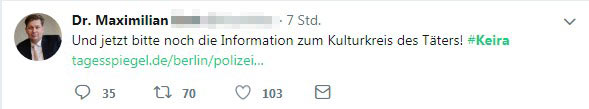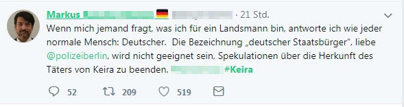 Welchen Ariernachweis müsste die Polizei wohl bei ihren Ermittlungen erbringen, damit er für die rechte Sphäre als „deutscher Täter“ durchgehen würde? Wie viele Generationen müssen ins Land gehen, um deutsch genug zu sein? Und was für ein rassistisches Weltbild wird hier eigentlich verbreitet?