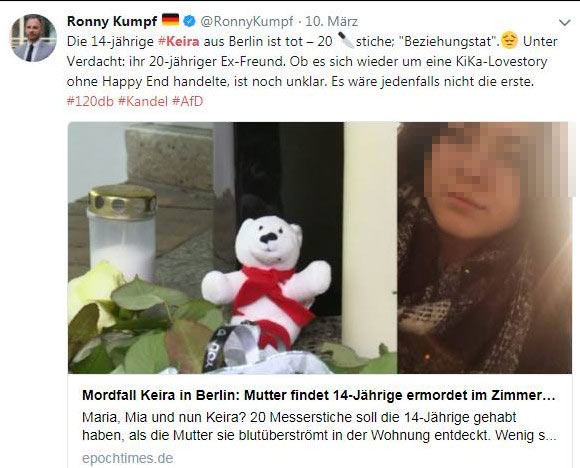 Der „Epoch Times“-Artikel wie auch rechte Blogs veröffentlichen hemmungslos und im Namen ihrer angeblichen Wahrheit den vollen Klarnamen des 14-jährigen Opfers. Ebenso mehr oder weniger zahlreiche Fotos, die offenbar ihren Social Media Profilen oder Berichterstattung über sportliche Erfolge des Mädchens entnommen sind. Haben Eltern in dieser Situation noch die Kraft, sich einen Anwalt zu nehmen und mit Recht am eigenen Bild gegen den Missbrauch zu klagen? Offenbar hoffen die Autoren darauf, dass dies nicht der Fall ist.
