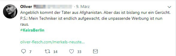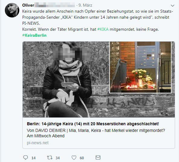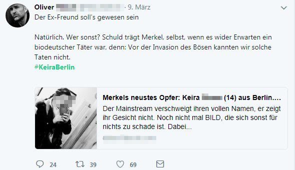 Am gestrigen Abend, nach Beendigung dieses Artikels, ergab sich noch eine neue Volte rechter Internet-Agitation: In der rechten Sphäre wurden – angestoßen durch rechtspopulistische Internetprominenz wie Pegida-Frontmann Lutz Bachmann und den bereits im Artikel erwähnten Ex-„Journalisten“ – Social Media Fotos eines völlig unschuldigen Jungen geteilt mit der Angabe, es handle sich um den geständigen Täter – nur weil der den gleichen Vornamen und das gleiche Initial des Nachnamens wie der Täter trug. Inzwischen sind die Beiträge gelöscht, wohl aus Angst vor der Strafverfolgung. Gut beschrieben hier: