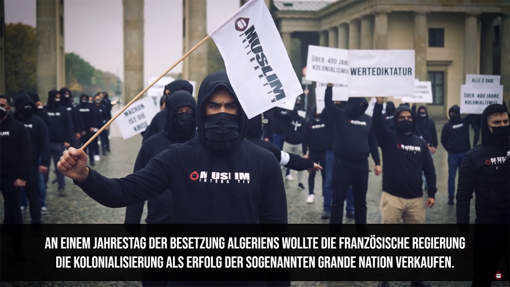 Einen Monat zuvor, im Oktober 2020, führte „Muslim Interaktiv“ eine ähnliche Aktion vor der französischen Botschaft am Brandenburger Tor durch: Etwa 70 Anhänger der Bewegung versammelten sich am Pariser Platz – einen Tag, nachdem drei Menschen in einer mutmaßlich islamistischen Terrorattacke in Nizza mit einem Messer erstochen wurden. Doch um Gedenken ging es „Muslim Interaktiv“ nicht: Auch hier trat die Gruppe uniformiert in militärisch anmutender Formation auf. Anlass war ein rassistischer Messerangriff am 18. Oktober nach einem Streit auf zwei muslimische Frauen in Paris. „Nicht der Islam, sondern Frankreich steckt in der Krise!“ stand auf einem Transparent der Gruppe – in Antwort auf Macrons Aussage, der Islam würde überall auf der Welt in der Krise stecken. Denn kaum zwei Wochen zuvor wurde der Lehrer Samuel Paty nach einer Hetzkampagne gegen ihn von einem islamistischen Täter brutal ermordet. Auch dazu äußerte „Muslim Interaktiv“ nicht. Nach der Aktion folgte prompt das Video „#LaGrandeTyrannie Frankreich“, das inzwischen knapp 10.000 Aufrufe hat (Stand: Juni 2021).