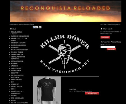 Wie die taz berichtet, hat die Berliner Staatsanwaltschaft Räume des „Reconquista“-Internetversands durchsucht, der T-Shirts mit rechtsextremen und ausländerfeindlichen Motiven unter anderem im Zusammenhang mit der Nazi-Mordserie angeboten hat. Gegen zwei Geschäftsführer wurde ein Verfahren wegen Volksverhetzung eingeleitet. Ein Sprecher der Staatsanwaltschaft gab an, dass mehrere Anzeigen gegen den Versand vorlagen, die zu vier Durchsuchungsbeschlüssen geführt hätten. Daraufhin wurden Wohn- und Geschäftsräume sowie die Wohnung eines Verwalters in Berlin und im Berliner Umland untersucht. Computer wurden beschlagnahmt. „Die T-Shirts waren wohl noch nicht ausgeliefert“, sagte der Sprecher. Das T-Shirt wird mittlerweile nicht mehr auf der Internetseite angeboten, andere Shirts mit rechtsextremen Slogans werden weiter verkauft.