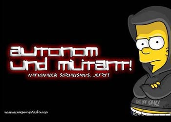 Militanz und Gewaltbereitschaft zeigt sich auch in „Anti-Antifa“-Symboliken. Gemeint ist damit, vermeintliche politische Gegner ausspionieren und einschüchtern zu wollen. Interessant ist bei den „Autonomen Nationalist/innen“ die politische Einordnung, die manchmal auch als „grün“ erfolgt. „Autonome Nationalist/innen“ erschließen sich – mit der rechtsextremen Ideologie im Rücken – neue Themenfelder, die viele Jugendliche interessieren: so etwa Umweltschutz (als „Heimatschutz“ auf der Basis der Blut-und-Boden-Ideologie), Tierschutz (z.B. rassistische Argumente gegen das Schächten) oder Kapitalismuskritik („völkischer Antikapitalismus“ gemäß der NS-Parole „Gemeinnutz statt Eigennutz“ für die „Volksgemeinschaft“). Deshalb macht es Sinn, bei Profilen mit der Bildsprache einer autonomen Szene genauer hinzugucken. Bei „Autonomen Nationalist/innen“ trägt Bart Simpson manchmal ein antisemitisches „Fuck Israel“ auf dem T-Shirt. (ag/jb)