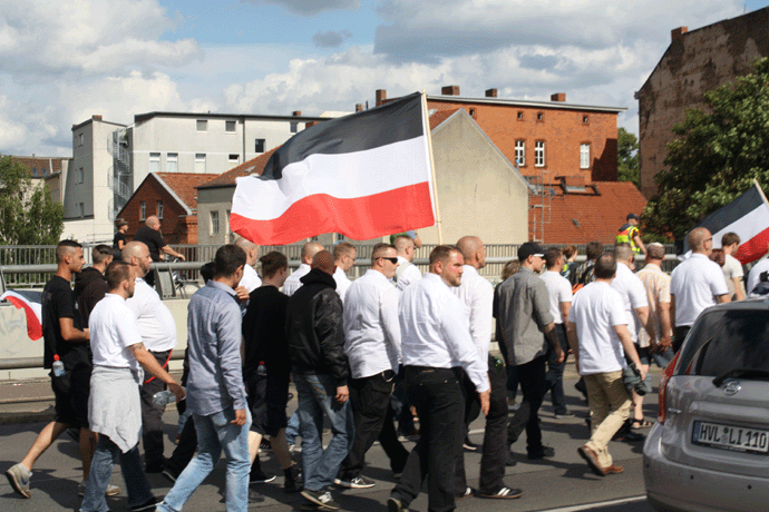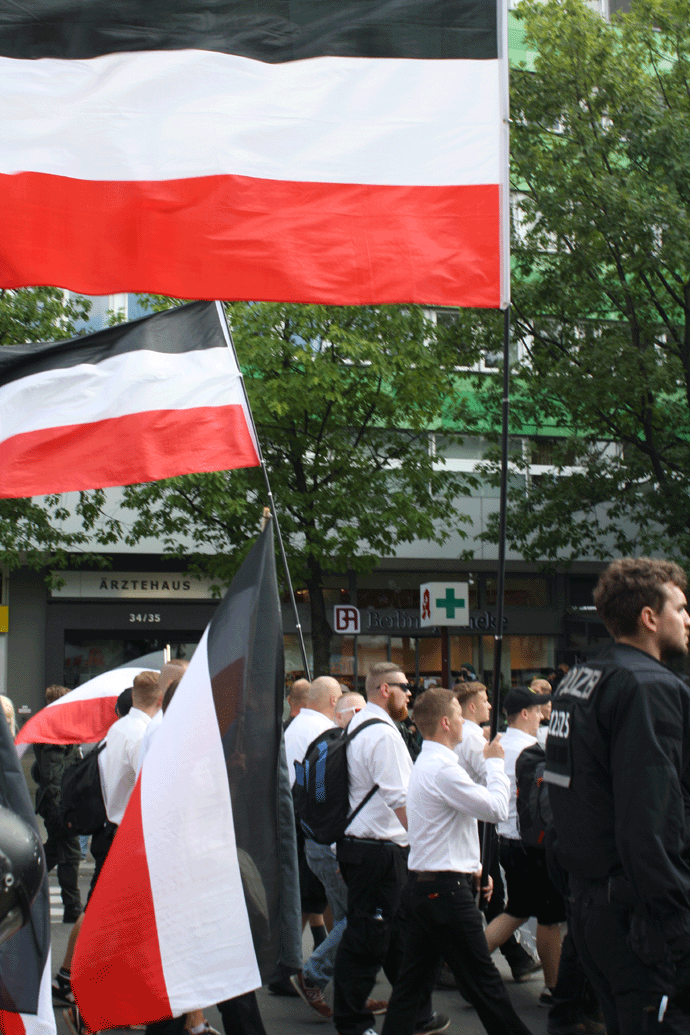 Der Anmelder des Gedenkmarsches hatte die Teilnehmer_innen im Vorfeld dazu aufgefordert, schwarze Hosen und weiße Hemden zu tragen.