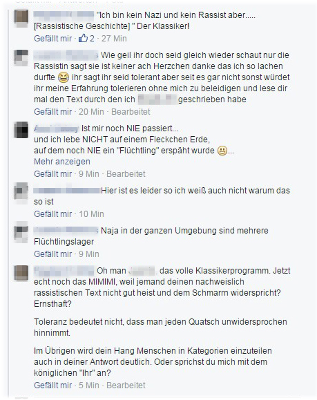 P.S. Interessante Wendung dann: Userin 1 gibt, nachdem ihr viele andere User_innen widersprochen haben, an, sie habe ihre Statements nur gepostet, um mal zu zeigen, dass man auf provokative Äußerungen nicht ausgrenzend reagieren soll. Diese strategische Volte ist selbst mir neu; sollte sie dies ernst meinen, scheint mir die Taktik auch nicht sehr zielführend, zumal sie weiter rechtspopulistische Sprache verwendet.