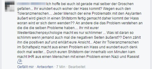 Wer ist also Schuld am Hass? Toleranzmenschen. Das sind offenbar „Wir“. Im Gegensatz zu „ihr“. Denn „Toleranzmenschen“ machen jeden fertig, der ein Problem mit „Asylanten“ (Wortwahl, sic!) hat. Deshalb muss man sich dann ja wenden „An andere die das Probelm verstehen an die die die selben Probelme haben“ (Fehler im Original). Also müssen sich Rassistinnen an andere Rassisten wenden, weil sonst keiner ihre Probleme versteht? Nun, die Antwort ist vermutlich: Ja. Aber verantwortlich ist man dann schon selbst.
