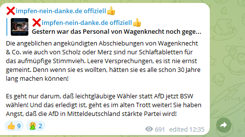 Grundtenor der Vorwürfe an das BSW ist: Es würde sich bei der Partei um ein „trojanisches Pferd“ handeln, welche das „deutsche Stimmvieh“ abgreifen wolle, um das Land anschließend in eine erneute SED-Diktatur zu führen – oder zumindest auf dem aktuellen Kurs beizubehalten. Gerade dass das Bündnis eine Zusammenarbeit mit der AfD vorerst ausschließt, wird hier als primäres Argument genannt. Diese These zieht sich durch das komplette verschwörungsideologische und rechte Spektrum: von großen „Nachrichten“-Outlets wie dem verschwörungsideologischen Portal „AUF1“, populistischen Blogs wie „Jouwatch“ und „Tichys Einblick“ bis hin zu Rechtsextremen wie Martin Sellner, der jedoch deutlich sagt, dass der Linkspatriotismus des Bündnisses die AfD durchaus ein paar Stimmen kosten könnte – eine wirkliche Gefahr stelle sie aber nicht dar. Besonders amüsant ist ein Video aus einem Telegram-Kanal, der sich am äußersten Rand der Verschwörungs-Szene verortet: hier ist die Machtpolitikerin nicht nur knallharte Kommunistin, sondern auch jüdisch (weil: wer außer Jüdinnen und Juden steckt denn hinter dem Kommunismus?) und „wahrscheinlich ein Transgender“. Letztendlich sprechen aus den rechten Vorwürfen jedoch zwei Punkte: einmal der projektive Hass auf alles auch nur ansatzweise als „links“ Wahrgenommene, und andererseits durchaus eine Sorge, Stimmen an die linkspopulistische Partei zu verlieren.