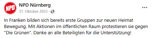Die Selbstbeschreibung dazu spricht von einer „außerparlamentarischen Opposition“, die wirken soll als „Netzwerker, Dienstleister und Aufklärer für alle, denen unsere Heimat im Herzen liegt“. Offene Bezüge zur NPD fehlen taktischerweise. Die NPD Nürnberg aber bewirbt etwa auf ihrem Facebook-Kanal die vermeintliche Bewegung „Heimat Franken“ begeistert: „In Franken bilden sich bereits erste Gruppen zur neuen Heimat Bewegung. Mit Aktionen im öffentlichen Raum protestieren sie gegen ‚Die Grünen’. Danke an alle Beteiligten für die Unterstützung!“