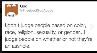von no-nazi.net, Belltower.news und fussball-gegen-nazis.de Malte, no-nazi.net (Facebook, Twitter, Blog, G+)Monitoring, Aufklärung, Argumente, Konzepte, Humor God (Twitter, Facebook): Humor für Gleichwertigkeit und gegen alles Schlechte auf der Welt bieten die englischsprachigen Accounts von Gott. Das Gute: Gott hat nicht nur eine natürliche Autorität, was die Interpretation des Weltgeschehens angeht, sondern auch viele Fans und damit große ReichweiteAufklärung, Erleichterung (Humor), Information.