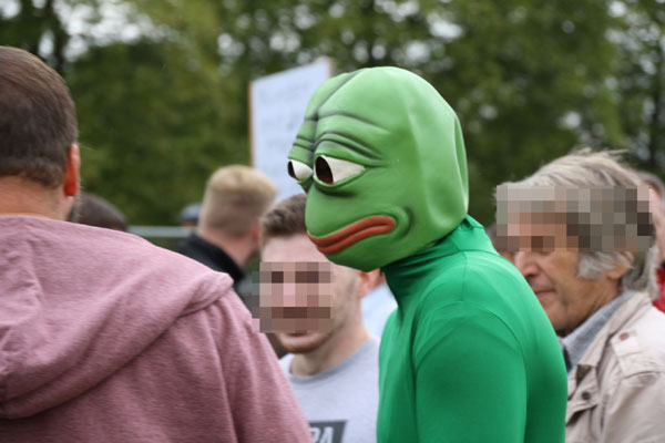 Mit “Europa Nostra” wollte die IB ein “Zeichen für die patriotische Jugend” setzen. Immerhin kamen letztes Jahr zur Identitären Demo nach Berlin rund 800 Unterstützer*innen. Diese bleiben dieses Jahr definitiv aus. Die ganze Veranstaltung wirkt wie eine krude Mischung aus Messe und Volksfest. Zur Hochphase sind höchsten 500 Besucher*innen da, am Abend maximal 200. Das typische Dresdner Pegida-Publikum sitzt mit Deutschland-Accesoires behängt auf Bierbänken und isst Wurst, Altersdurchschnitt Ü50. Ein Mensch läuftden ganzen Tag in einem nicht sehr kleidsamen “Pepe the Frog”-Kostüm herum. Götz Kubitscheks Kinder müssen sich am Stand von seinem Antaois-Verlag präsentieren. Das senkt den Altersdurchschnitt ein wenig.