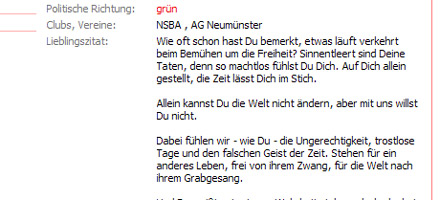 Interessante Selbstverortung: „Politische Richtung: grün; Clubs: NSBA (=“Nationale Sozialisten, Bundesweite Aktion“, Slogan der Autonomen Nationalisten)