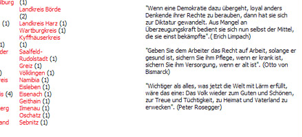 Dann nennt Apfel noch ein paar ?Lieblingszitate? eher unbekannter nationalistischer Literaten und von Otto von Bismarck. Die verbindende Kraft der Mitgliedschaft in Gruppen hat Holger Apfel während seines kurzen Aufenthalts (sechs Tage) bei MeinVZ nicht mehr ausprobiert. Ehefrau Jasmin war zugleich im StudiVZ unterwegs ? allerdings etwas geschickter, da sie alle Informationen nur ?Freunden? zugänglich machte. Von Holger Apfels Profil aus ließen sich dagegen die Freundeslisten durchforsten, um an weitere Erkenntnisse zu gelangen.