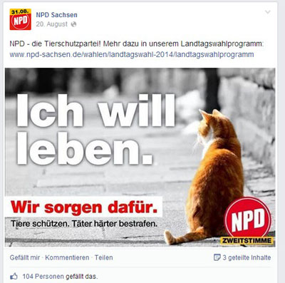 Dagegen versuchen es die NPD-Kandidaten in ihren Wahlkampfmaterialien off- und online, sich auch für nicht-rechtsextreme Bürger*innen als wählbare Partei darzustellen. Wieschke stellt nicht das einzige Weichspül-Beispiel dar: Im aktuellen Wahlkampf wurde aus dem offen martialisch-demokratiefeindlichen Langzeit-Kampagnenthema der NPD „Todesstrafe für Kinderschänder“ ein dieselbe Thematik verniedlichendes „Kinderschutz statt Kuscheljustiz“. Und setzte die NPD einst noch vor allem für den Tierschutz ein, weil sich so etwa über die Thematik des Schächtens trefflich gegen Muslime und Juden hetzen ließ, so gibt nun vor allem sinnentleerte Motive wie dieses: