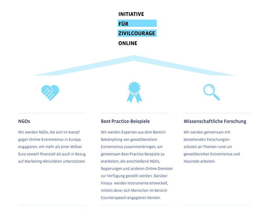 Die Initiative für Zivilcourage Online wird europäische NGOs, die sich im Kampf gegen Online-Extremismus in Europa engagieren, mit mehr als einer Million Euro sowohl finanziell als auch in Bezug auf Marketing-Aktivitäten unterstützen. Die Initiative wird außerdem Experten aus dem Bereich der Bekämpfung von gewaltbereitem Extremismus zusammenbringen, um gemeinsam Best Practice Beispiele zu erarbeiten, die anschließend NGOs, Regierungen und anderen Onlinediensten zur Verfügung gestellt werden. Darüber hinaus werden Instrumente entwickelt, mittels derer sich Menschen im Bereich Counterspeech engagieren können.
