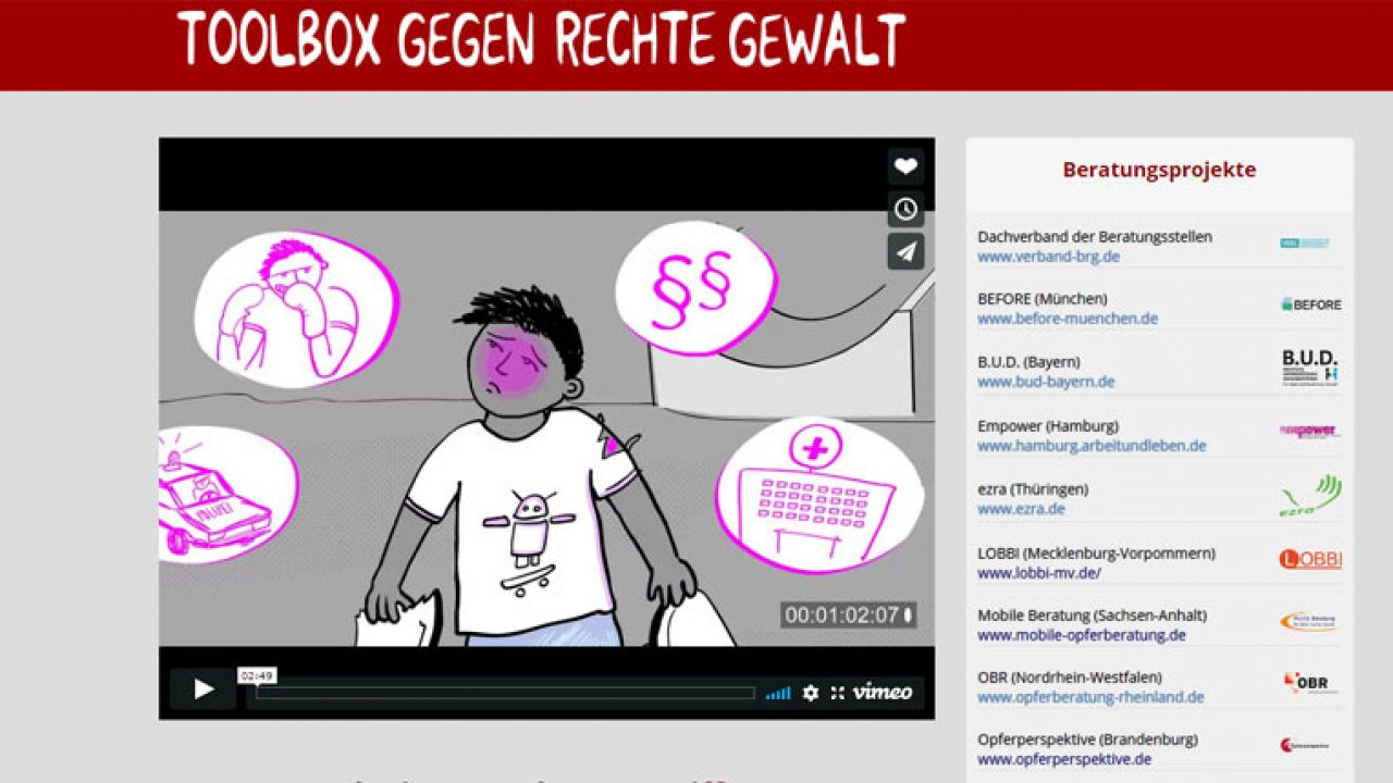 Auf www.toolbox-gegen-rechts.de finden sich Hinweise und Informationen zum Umgang mit rechter, rassistischer und antisemitischer Gewalt. Das Angebot richtet sich speziell an Jugendliche, die auf Grund ihrer Herkunft, Hautfarbe, sexuellen Orientierung oder ihres politischen Engagements zu Angriffszielen von rechten GewalttäterInnen geworden sind.