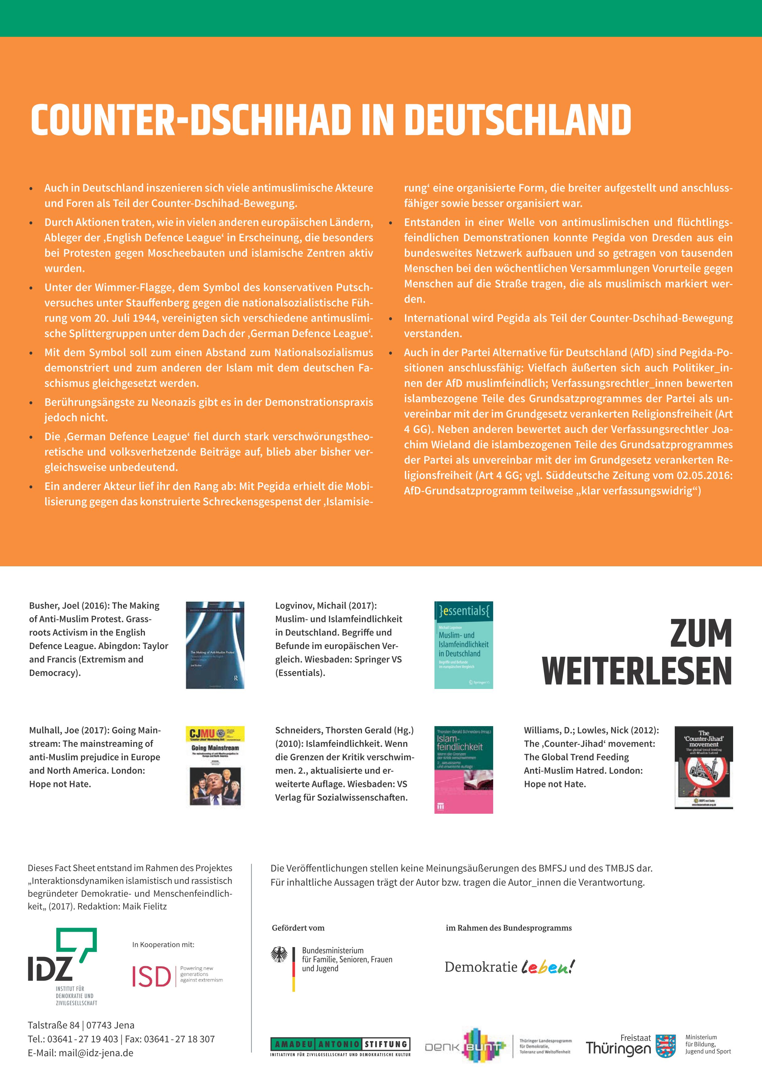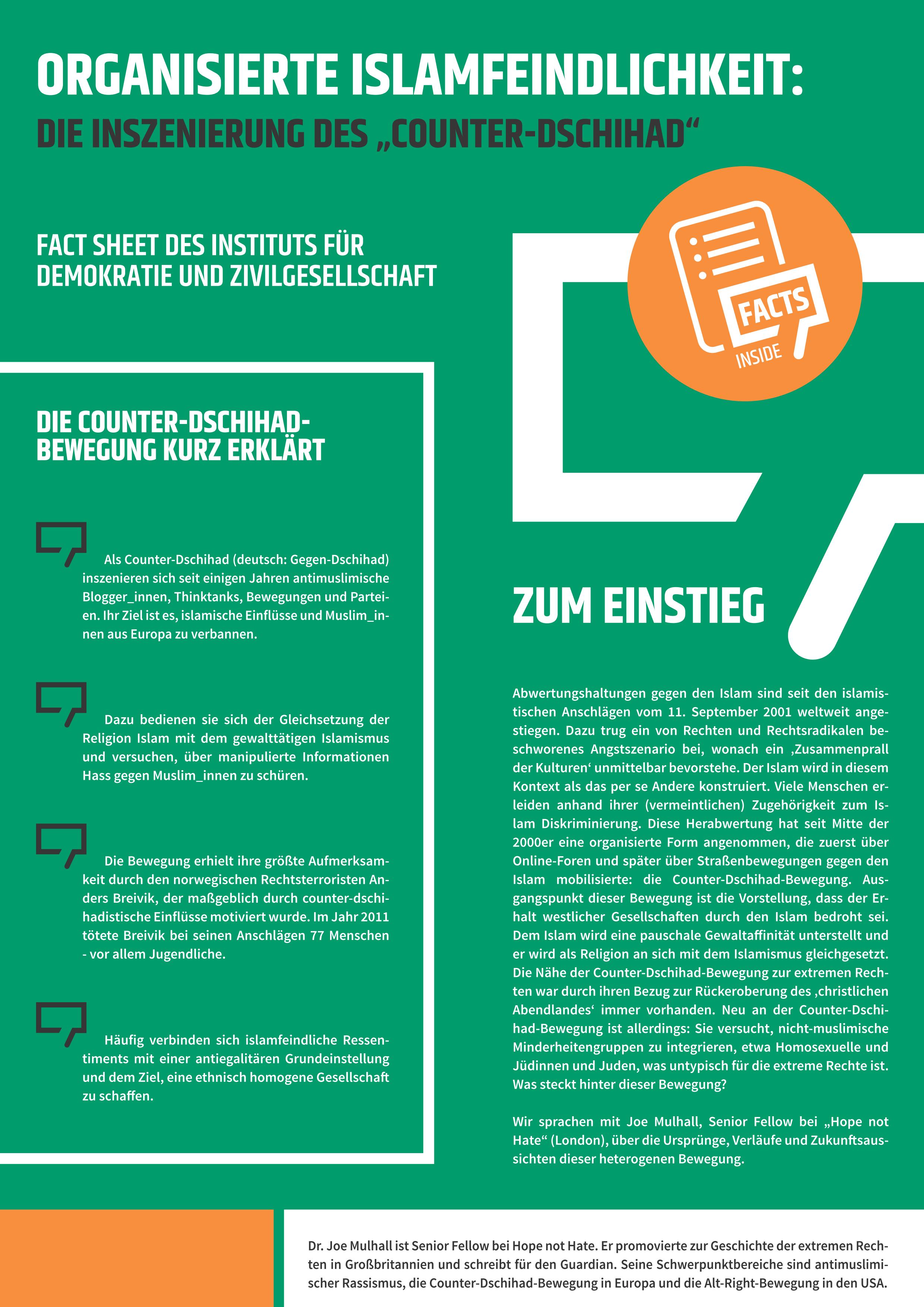 Abwertungshaltungen gegen den Islam sind seit den islamistischen Anschlägen vom 11. September 2001 weltweit angestiegen. Dazu trug ein von Rechten und Rechtsradikalen beschworenes Angstszenario bei, wonach ein ‚Zusammenprall der Kulturen‘ unmittelbar bevorstehe. Der Islam wird in diesem Kontext als das per se Andere konstruiert. Viele Menschen erleiden anhand ihrer (vermeintlichen) Zugehörigkeit zum Islam Diskriminierung. Diese Herabwertung hat seit Mitte der 2000er eine organisierte Form angenommen, die zuerst über Online-Foren und später über Straßenbewegungen gegen den Islam mobilisierte: die Counter-Dschihad-Bewegung. Ausgangspunkt dieser Bewegung ist die Vorstellung, dass der Erhalt westlicher Gesellschaften durch den Islam bedroht sei. Dem Islam wird eine pauschale Gewaltaffinität unterstellt und er wird als Religion an sich mit dem Islamismus gleichgesetzt. Die Nähe der Counter-Dschihad-Bewegung zur extremen Rechten war durch ihren Bezug zur Rückeroberung des ‚christlichen Abendlandes‘ immer vorhanden. Neu an der Counter-Dschihad-Bewegung ist allerdings: Sie versucht, nicht-muslimische Minderheitengruppen zu integrieren, etwa Homosexuelle und Jüdinnen und Juden, was untypisch für die extreme Rechte ist. Was steckt hinter dieser Bewegung?