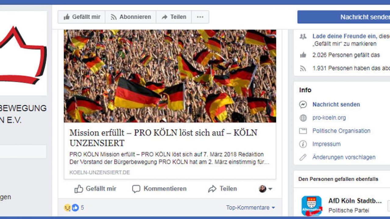 Bereits im November 2017 hatte die rechtspopulistische Kleinpartei „pro Deutschland“ aufgrund ihrer Perspektivlosigkeit die Selbstauflösung beschlossen. (vgl. BTN, bnr, hagalil). Auch „pro Köln“, die noch mit zwei Mandaten im Kölner Stadtrat vertreten sind, stimmte dem zu, wollte aber dennoch weiterarbeiten.