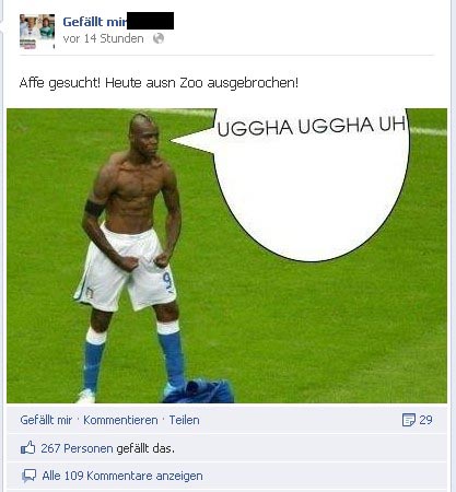 In Sozialen Netzwerken wie Twitter oder Facebook lassen viele Menschen ihren Emotionen freien Lauf. So auch während und nach dem EM-Halbfinalspiel von Deutschland gegen Italien. Das Ergebnis hieß 2:1 für Italien, der Torschütze beider italienischen Tore war der schwarze Spieler Mario Balotelli. Dabei tun sich Untiefen auf, welcher rassistische Sprachgebrauch für viele ganz normal scheint. Wer für jeden Kommentar, der Balotelli entweder mit dem N*-Wort beleidigte oder ihn mit einem Affen verglich, einen Euro bekommen hätte, wäre heute eine reiche Person. Wie der vielverteidige Party-Patriotismus bei nicht wenigen Fans vom Fähnchenschwingen in niedersten Rassismus umschlägt, konnte man auch in Kommentarspalten der Medien beobachten, bis diese geschlossen oder moderiert wurden.