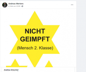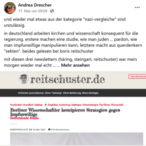 Andrea Drescher kommt aus der „Friedensbewegung” und veröffentlichte kürzlich das Buch „Menschen mit Mut”, in dem sie Interviews mit Impfgegner*innen, Coronaleugner*innen und Verschwörungsaktivist:innen führt. Sie selbst inszeniert sich immer wieder als wahrhafte Antifaschistin und legitimiert ihre Holocaust-Vergleiche mit ihrer jüdischen Familiengeschichte. Sie prophezeit eine Zweiklassengesellschaft aus geimpften und nicht-geimpften Personen und spricht immer wieder von einem „Ermächtigungsgesetz”.