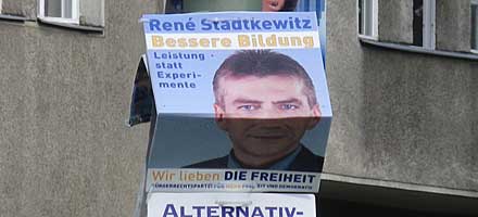 Und dann gibt es noch „Die Freiheit“. Deren Kopf René Stadtkewitz benahm sich als Noch-CDU-Mitglied so, dass es der konservativen Partei zu islamfeindlich wurde und er aus Fraktion und Partei ausgeschlossen wurde. So gründete er eine eigene Partei, und die hat den Slogan: „Wir lieben die Freiheit!“ Aber wessen Freiheit, und mit welchen Werten? Hier fordert er: „Bessere Bildung“. Was damit gemeint ist, steht in der Unterzeile: „Leistung“. Leistung ist natürlich nicht Schlechtes. Wenn sie aber das oberste Ziel von Bildung sein soll, erinnert das an ein „Nützlichkeitsdenken“ vom Menschen, das problematisch werden kann.