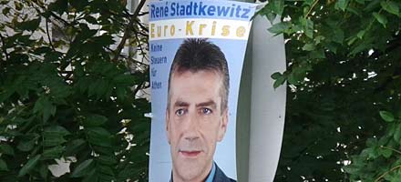 Hier aber greift die „Freiheit“ ein Thema auf, dass auch die NPD auf ihre Plakate druckte: Die „Euro-Krise“. Die Unterzeile hier ist Populismus pur: „Keine Steuern für Athen!“ Wer hier „Genau!“ denkt, muss sich auch fragen lassen, wie denn dann mit dem Problem überschuldeter Länder in der Euro-Region umzugehen sei. Die „Freiheit“ bleibt die Antwort schuldig. Das Gefühl einer unüberschaubaren Politik, vor der der Betrachter vielleicht schon wieder Angst hat, weil man sie nicht durchschaut, ist aufgebracht.