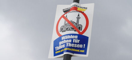 Deshalb verwendet die „Pro“-Bewegung auch immer das hier abgebildete Symbol der durchgestrichenen Moschee. Um zugleich die imaginierte große gesellschaftliche Akzeptanz für ihre Islamfeindschaft zu untermauern, wird im Slogan an Immer-noch-SPD-Politiker Thilo Sarrazin und sein biologistisch-islamfeindlich argumentierendes Buch „Deutschland schafft sich ab“ erinnert. So direkt mochte Sarrazin allerdings dann doch nicht mit Rechtspopulisten in Verbindung gebracht werden: Er klagte gegen die Verwendung seines Namens auf den Plakaten, was zu diesem Ergebnis führte: