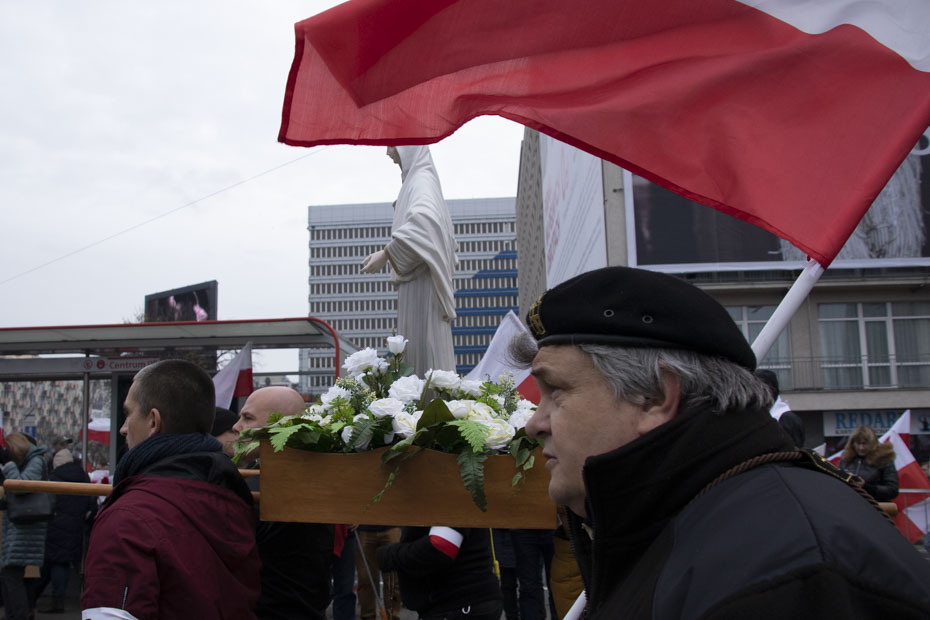 Bereits am Vormittag waren zahlreiche Stände im Stadtzentrum von Polen aufgebaut. Hier wurden Kuscheltiere, Obst und allerhand Kitsch in den polnischen rot-weißen Nationalfarben verkauft. Von Schals, Blumenkränzen und Armbinden war alles dabei, was das patriotische polnische Herz höher schlagen lässt. Auch Embleme mit antikommunistischer, christlicher und anti-queerer Symbolik wurden hier verkauft. Immer mehr Menschen versammelten sich bis 14 Uhr auf dem Rondo Romana Dmowskiego. Der Platz versank in einem Fahnenmeer.