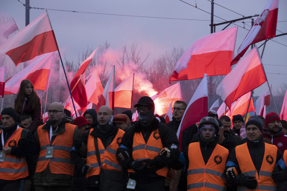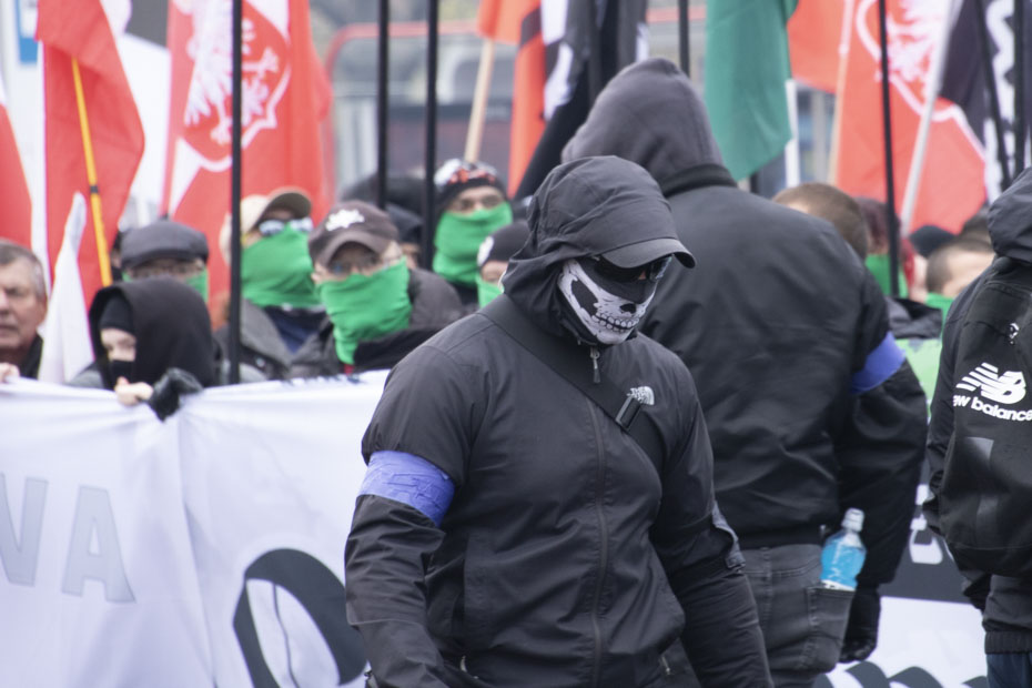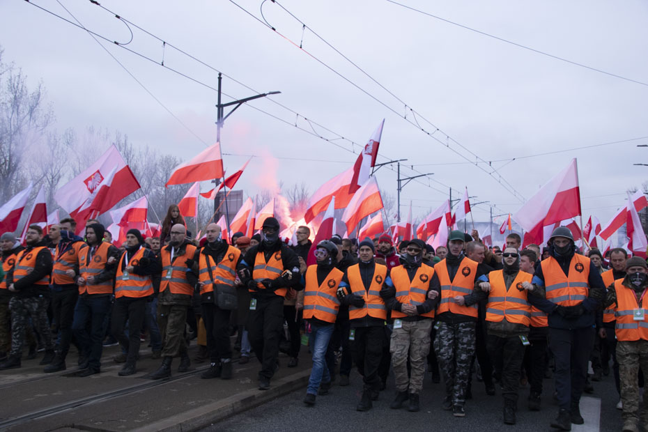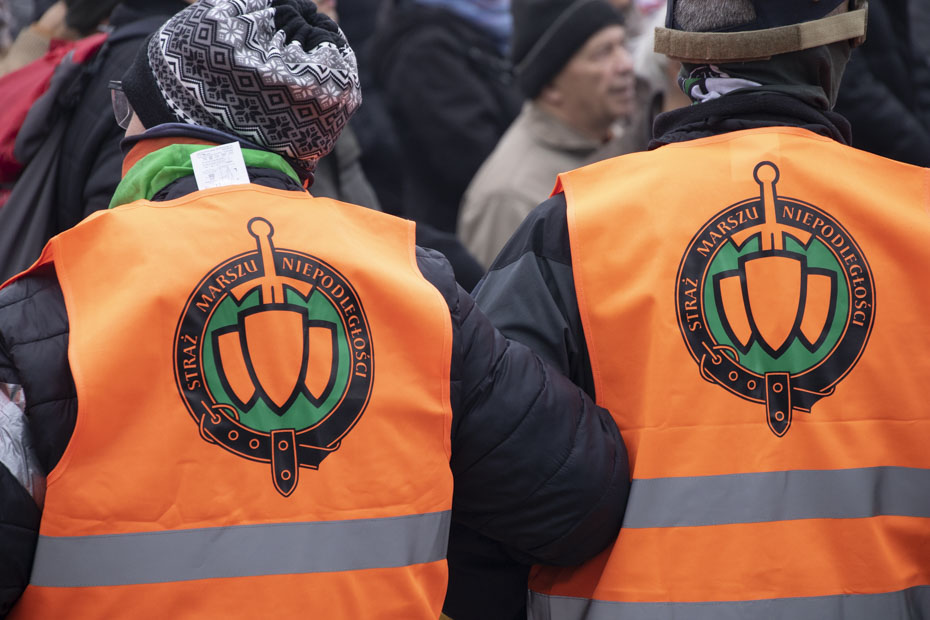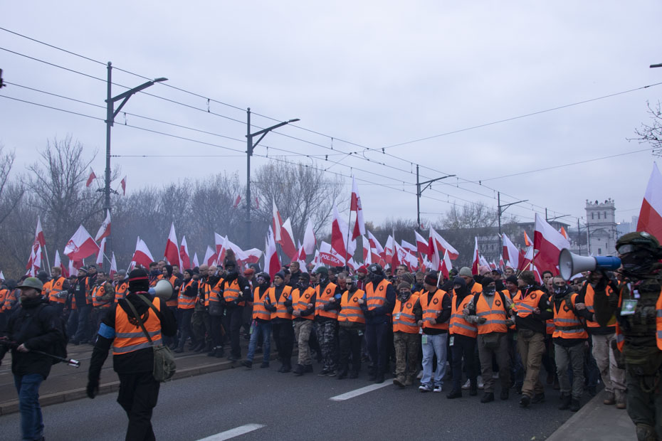 Während der gesamten Strecke war kaum Polizei zugegen. Die hatte im Vorfeld die Demonstrations-Route großflächig abgeriegelt. Die Sicherung der Veranstaltung oblag ausschließlich einer extrem rechten, paramilitärisch auftretenden Gruppe, dem „Straż Marszu Niepodległości“ (SMN), die gleichzeitig auch Veranstalter des Marsches sind. Da zu jener Zeit keine Sicherheitskräfte zugegen waren, entstand damit ein quasi rechtsfreier Raum.