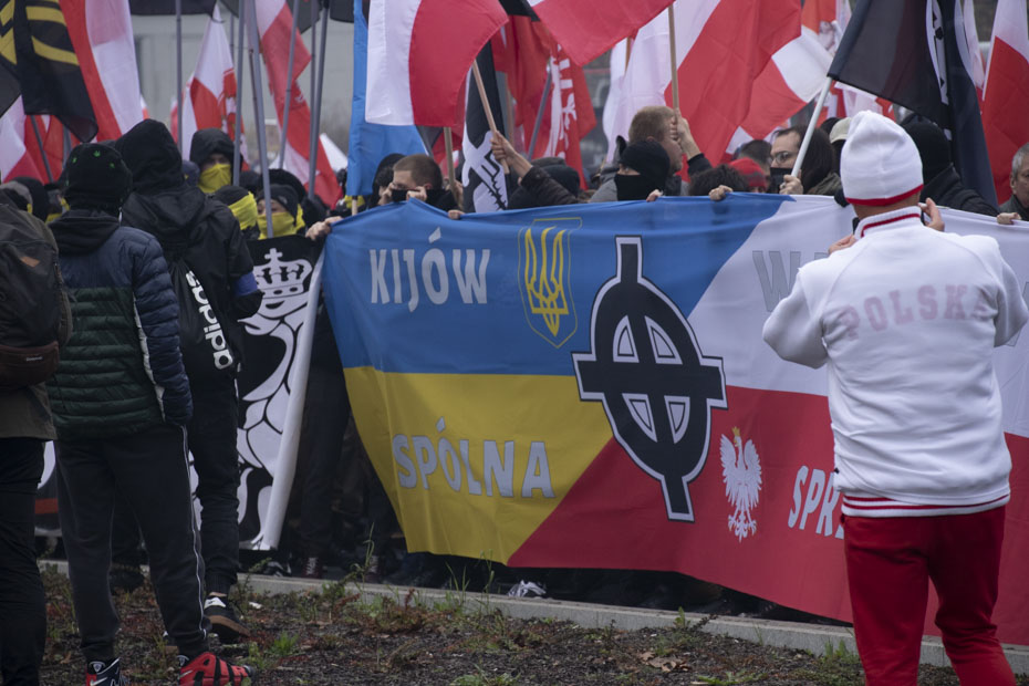 Das zentrale Thema an diesem Tag war der russische Angriffskrieg auf die Ukraine. Der rechtsextreme Politiker Grzegorz Braun forderte mit seinem Transparent etwa „Stoppt die Ukrainisierung Polens“. Die meisten Teilnehmer*innen zeigten sich jedoch solidarisch mit der Ukraine. Am sichtbarsten war dies wohl im letzten Demo-Block, bei den Neonazis, den Autonomen Nationalist*innen.