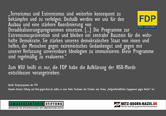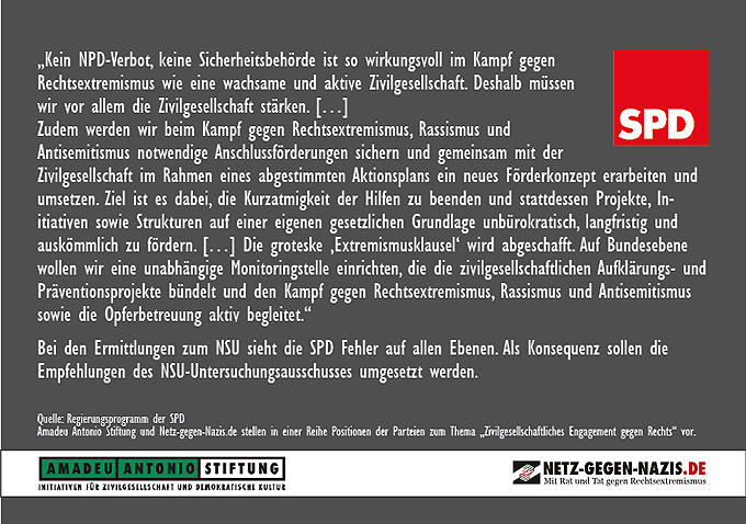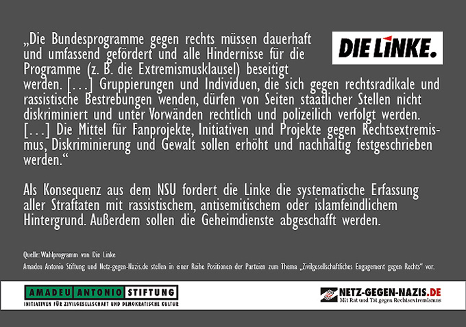 Leider finde ich die Wahlprogramme alle nicht überraschend oder innovativ. Nach der Aufdeckung der jahrelangen Mordserie des NSU ist die Bundesregierung in hektische Aktivität verfallen. Neue Gesetze, Abwehr- und Kompetenzzentren sollen nun die Fehler der Vergangenheit kompensieren. Aber auch die Opposition in Gestalt von Thomas Opperman, im Kompetenzteam von Peer Steinbrück für Innenpolitik zuständig, hat einen Masterplan gegen Rechtsextremismus gefordert. Deswegen ist es erstaunlich, dass gerade bei den bisherigen Regierungsparteien und der SPD die Lehren aus dem NSU in den Wahlprogrammen eine verhältnismäßig geringe Rolle spielen, Querverweise zu einer vernünftigen Einwanderungs- und Flüchtlingspolitik fehlen auch fast ganz. Stattdessen gibt es immer noch die relative überflüssige Forderung nach einem Verbot der NPD, das nicht schadet, aber wenig nützt.