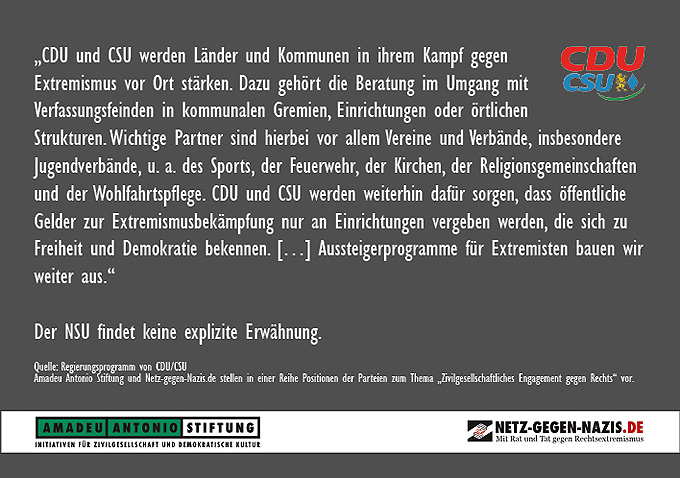 Die vom Bundesfamilienministerium geforderte sogenannte Extremismuserklärung ist so ziemlich das Gegenteil dessen, was von den Initiativen als Unterstützung verstanden wird. Seit deren Einführung stellt ihre Unterzeichnung die Grundvoraussetzung für eine Förderung durch den Bund dar. In ihr müssen sich die Projekte selbst, aber auch ihre Partner, zur freiheitlich demokratischen Grundordnung bekennen und für ihre Partner haften. Die Erklärung ist in ihrer Beliebigkeit nicht nur ein Symbol des Misstrauens, sondern auch eine Androhung der permanenten Kontrolle bis hin zur Mittelrückforderung. Gerade das Wahlprogramm von CDU/CSU liest sich hier eher als Bestätigung des Vorurteils, dass die meisten Engagierten gegen Rechts linksextrem seien.