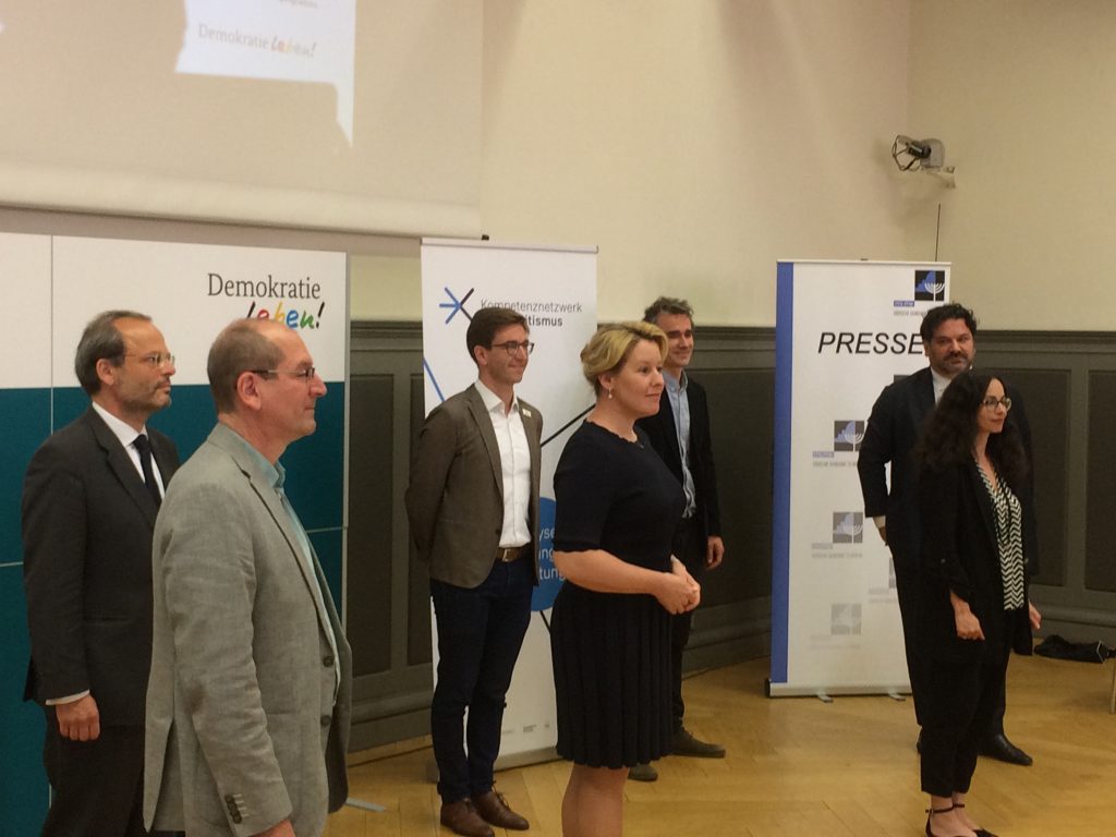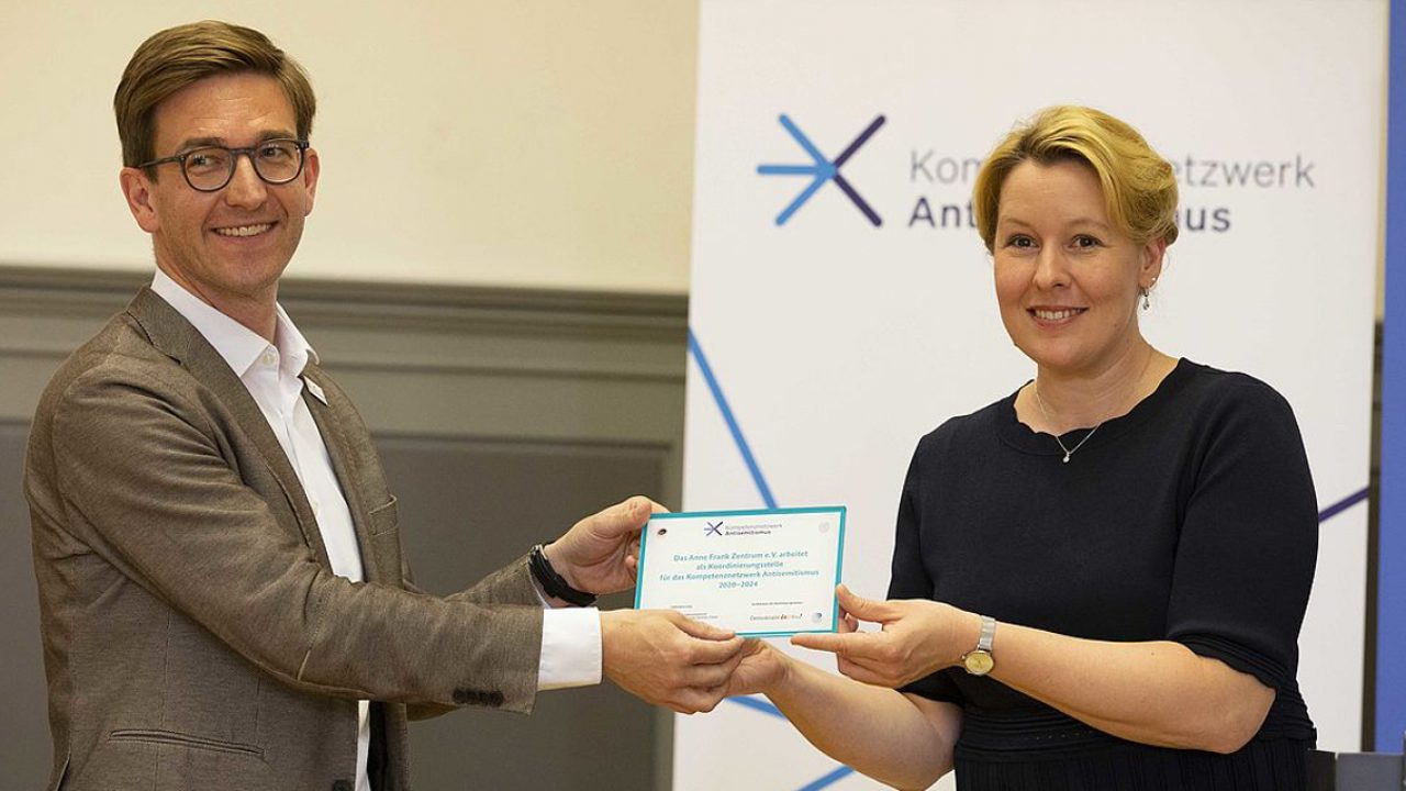 Auch Dr. Franziska Giffey, Bundesministerin für Familie, Senioren, Frauen und Jugend, betonte die hohe Relevanz der erfolgten Bündelung von Kräften gegen Antisemitismus. Der Terroranschlag von Halle sei nur die sprichwörtliche Spitze des Eisbergs, und auch die bereits deutlich gestiegenen Zahlen des Bundeskriminalamtes seien das sogenannte Hellfeld von Antisemitismus. Hass auf Juden und Jüdinnen sei alltäglich und müsse daher auch im Alltag und stetig bekämpft werden. Der Zusammenschluss zum Kompetenznetzwerk sei ein „großer und wichtiger Schritt“, den sie ausdrücklich unterstütze. Daher soll die gemeinsame Arbeit vom Bundesprogramm „Demokratie leben!“ bis sicher 2024 unterstützt werden, mit bis zu 500.000 Euro pro Träger jährlich: „Unsere Gesellschaft braucht ihre Expertise“.