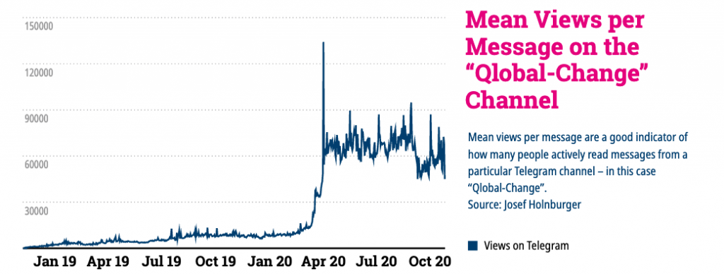 This increase in users during the pandemic can be explained by analyzing the second-largest QAnon channel on Telegram. On March 17, roughly 21,000 users were subscribed to the channel Qlobal-Change; three months later, on June 17, the channel had more than 111,000 subscribers. The number then rose steadily, peaking at over 127,000 by the end of October. Telegram channels are one-way communication channels, and looking at the number of subscribers alone can often be misleading: voyeurism and the like often leads people to subscribe to a channel. A better measurement of their reach is obtained by looking at how many people have actually seen their messages. At the beginning of February, around 9,000 people on average had viewed posts on Qlobal-Change; by the beginning of April, the figure stood at around 60,000 people. In addition, 34 groups that primarily distribute QAnon content were found on Telegram, with the number of members rising substantially in March. While there were only around 6,500 users on March 17, this figure had risen to more than 50,000 in mid-June and 79,505 by the end of October.