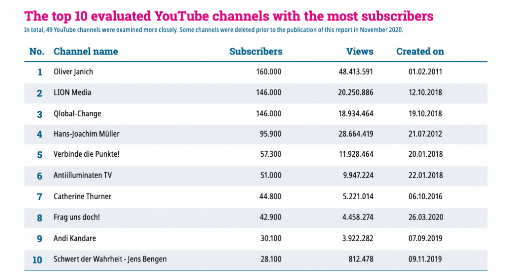 Oliver Janich was the largest German QAnon influencer for a long time. By now, however, many of his accounts have been deleted. After his removal from Instagram (2019) and Twitter (2020), his YouTube channel was deleted on October 22. The former journalist has been part of the German conspiracy scene since the September 11 attacks. He has been posting QAnon content since 2017, particularly on YouTube – long before it attracted the attention of the wider German public. He also shares a great deal of QAnon content on Telegram via “Oliver Janich öffentlich”, the largest German-speaking QAnon channel. Already high, his number of subscribers rose from 50,400 on March 17 to 125,000 on June 17 and over 152,600 by the end of October. For a long time, Janich was also one of the most popular YouTube channels distributing QAnon content. Before it was deleted, it had 280,000 subscribers. A video uploaded on April 2, 2020 titled “Adrenochrome – Xavier Naidoo cries for our children”, which contains a clear reference to QAnon, amassed over 495,000 views.
