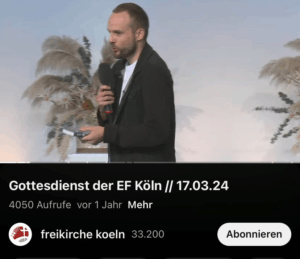Ungefähr vier Jahre später kündigt Töws feierlich ein Zeugnis-Video von Sima Suso an, in dem der Fußballer von der Freikirche Köln getauft wird. Bedingung dafür sei die Mitgliedschaft Susos in der Freikirche, so Töws. Zu den regelmäßig auftretenden Predigern zählt auch der Bremer Pastor Olaf Latzel. 2019 bezeichnete er in einer Rede Teilnehmer*innen des Christopher Street Day als „Verbrecher“ und erklärte Homosexualität zur „Degenerationsform der Gesellschaft“. Später leitet die Staatsanwaltschaft Ermittlungen wegen Volksverhetzung ein. Das Verfahren wurde im August 2024 gegen eine Geldauflage von 5.000 Euro eingestellt.