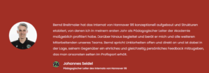 Neben der Arbeit an Schulen scheinen christliche Organisationen wie Fußball mit Vision auch gezielt im Nachwuchsbereich des Sports zu missionieren. Im Unterstützer-Team von Fußball mit Vision sitzt Bernd Breitmaier. Er ist nicht nur Berater für Fußball mit Vision, sondern auch Inhaber des Sportmentoring- und Coaching-Unternehmens „MenschProfi“. Das Angebot will Leistungssportler basierend auf einem christlichen Wertekanon beraten und bei Selbstreflexion, Zeitmanagement und Druck unterstützen. Breitmaier hat das Nachwuchsleistungszentrum von Hannover 96 mit aufgebaut.
