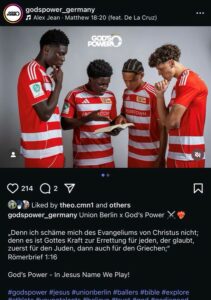 Inzwischen mischt auch die evangelikale Organisation „Gods Power Germany“ auf Social Media mit. Dort werden ebenfalls christliche Fußballprofis in Szene gesetzt. Gründer Jakes Boakye predigt für Kirchen, die Homosexualität verachten und als „pervers“ bezeichnen. Zuletzt kollaborierte Gods Power Germany mit Nachwuchsspielern der U19 von Union Berlin.