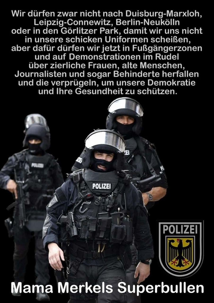 Darüber hinaus artikuliert sich auch eine generell verbreitete Ablehnung der Polizei. Generell schwankt die Rezeption der Polizei je nach deren Verhalten zwischen „Sie sind Teil des Volkes und sollten sich auf unsere Seite stellen“ und „Bezahlte Merkel-Söldner!!“
