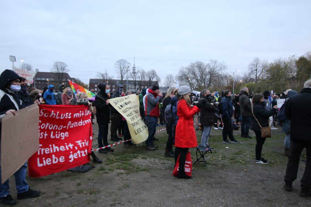 Kaputte Holzlatten und Polizist*innen umgrenzen den schmucklosen Kirmesplatz in Bochum-Gerthe. Bloß 300 „Querdenker*innen“ haben sich an diesem Samstag, dem 21. November 2020, am kargen Stadtrand nahe der Autobahn-Auffahrt und dem örtlichen Gefängnis versammelt. Traurig flattern weiße Luftballons rechts und links von der kleinen Bühne. Vermeintlich Bürgerliche, weniger schillernde Esoteriker*innen und Friedensbewegte hören Ärzt*innen und Anwält*innen zu. Es geht nicht um die große Verschwörung, sondern um lebensnahe Lügen, wie zum Beispiel, dass Kinder angeblich unter den Alltagsmasken sterben.