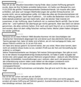 Im Laufe der Zeit gründeten enttäuschte Mandanten eine Telegram-Gruppe, in der sie das Ausmaß der Täuschung dokumentierten. Screenshots zeigen den Frust jener, die Fuellmich einst ihr Vertrauen schenkten – und nicht selten ihre letzten Ersparnisse. Viele berichteten von psychischen Belastungen und finanzieller Not. Als der Druck wuchs, löschte jemand die Gruppe – aber Volksverpetzer hatten alle Inhalte vorher gesichert.