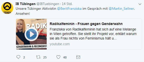 In einem Video, das “radikal feminin” auf ihrer Facebook-Seite geteilt haben, ist Annika S. im Gespräch mit Martin Sellner zu sehen. Hier spricht sie offen über ihre Mitgliedschaft in der IB Tübingen, bei der sie nach eigenen Angaben seit ca. einem Jahr aktiv ist.