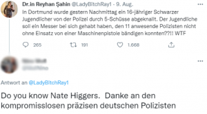 Wenn man die jeweiligen Anfangsbuchstaben von Nate Higgers tauscht, ergibt es Hate N* (ich hasse N*). Viele Social Media Plattformen benutzen automatische Filter, die bestimmte verletzende Begriffe automatisch sperrt. Indem sich User*innen immer wieder neue Begriffe für diskriminierende Sprache ausdenken, ist es schwer, sie auf großen Social Media-Plattformen zu sanktionieren.