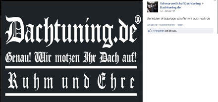 Wir können uns des Eindrucks nicht erwehren, dass es auf den „Dachtuning“-Internetpräsenzen um mehr als das Beschichten von Dächern geht. Sven Pannwitt, der sich in Internetforen als Inhaber zu erkennen gibt, bestreitet dies allerdings vehement: Sein Dachsanierungsbetrieb hat auf der Facebook-Präsenz sogar eine „Idiologie“ (Fehler im Original). Dort heißt es unter der Überschrift: „Alles Nazis?“: „Aufgrund unserer Schriftart und der vielen schwarzen Transporter wurden wir schon oft gefragt, ob wir rechter Gesinnung sind. Diesen Vorwurf können wir besten Gewissens verneinen. Unser Schriftzug ist Old London ( hat also nichts mit Nazi zu tun) und die Autos haben wir schwarz lackiert, weil wir uns optisch von unseren Mitbewerbern absetzen wollten. Diese Firmenstrategie hat uns mehr Vorteile gebracht als Nachteile.“ Letzteres scheint zu stimmen. Die Firma hat nach eigenen Angaben Standorte in Niendorf, Storkow, Bremen, Paderborn, Erlangen und Hanau. Um Missverständnissen vorzubeugen – man hört, P. klage gern -: Vielleicht ist „Dachtuning“ ein unpolitisches Unternehmen – auf alle Fälle tut es nichts Verbotenes. Es ist aber ein Unternehmen, dass offensiv mit (legaler) rechter und gewaltgutheißender Symbolik spielt. Die Entscheidung bleibt also beim Kunden oder bei der Kundin. Die müssen sich überlegen, ob sie sich diese Menschen aufs Haus holen möchten.