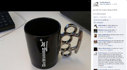 Insgesamt interessant ist die sehr aktive Facebook-Seite des Unternehmens. Hier postet „Dachtuning.de“ etwa ein Bild von einer (schwarzen) Hand mit zerissener Kette, die eine weiße Hand mit Peitsche festhält. Dazu der Kommentar: „Freiheit für …“ Die Nutzer*innen der Seite kommentieren, welches Land Freiheit braucht. Beliebt sind Palästina und Deutschland. Ein anderes Bild zeigt die Olympischen Ringe aus Stacheldraht mit dem Beisatz „Gaza 2012“. Der Kommentar: „Welche Überschrift passt zu diesem Foto? Wir überlassen euch Fans die Wahl!“ Das ist geschickt. Es wird ein Thema impliziert. Aber die Ausführung überlässt man anderen. Nutzer*innen, die auf der Facebook-Seite kommentieren, heißen etwa „Wotan der Braune“.