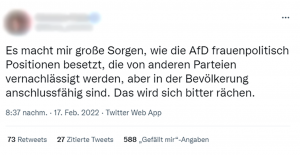 Am 17. Februar sorgte die AfD im Bundestag wieder einmal für Empörung. Die Abgeordnete Beatrix von Storch (AfD), angeblich gemäßigt innerhalb der AfD, behauptete in einer Debatte zum Internationalen Frauentag, die Grünen-Abgeordnete und trans Frau Tessa Ganserer sei „biologisch und juristisch ein Mann“. Offenbar ist von Storch nicht in der Lage, die Entscheidung eines Menschen, als das Geschlecht zu leben, das ihr richtig erscheint, als persönliche Erfahrung zu akzeptieren. Die pure Existenz von trans Personen ist in von Storchs Weltbild eine Ideologie:„Die Genderideologie gefährdet vor allem Frauen und Mädchen“, hetzt von Storch. Ohne Biologie gäbe es keine Frauen „und ohne Frauen auch keine Frauenrechte.“ Dann nannte von Storch Tessa Ganserer bei ihrem männlichen Namen und sprach sie fortlaufend in der männlichen Form an. Eine Rede, die zu Recht für Entsetzen sorgte, in der rechten und erzkonservativen Szene jedoch bejubelt wurde.