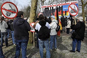 33 „Pro NRW“-Demonstranten bei „Mahnwache“, 400 Gegendemonstranten versperrten den Weg (DerWesten (II)).