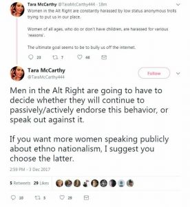 Danach schreibt sie: „Die Männer in der Alt-Right werden sich entscheiden müssen, ob sie dieses Verhalten passiv/aktiv tolerieren oder sich dagegen positionieren. Wenn ihr wollt, dass mehr Frauen öffentlich über Ethno-Nationalismus reden, solltet ihr euch für letzteres entscheiden.“
