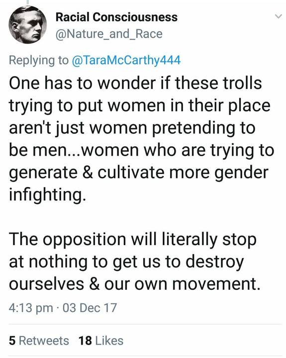In einer Reihe von Tweets hat McCarthy am 3. Dezember dieses Thema angesprochen: „Frauen in der Alt-Right werden permanent von anonymen Trollen belästigt, die versuchen uns zu sagen, wo wir hingehören. Frauen jeden Alters, egal ob sie Kinder haben oder nicht, werden aus den verschiedensten ‚Gründen‘ belästigt. Das Ziel scheint zu sein, uns aus dem Internet wegzumobben.“