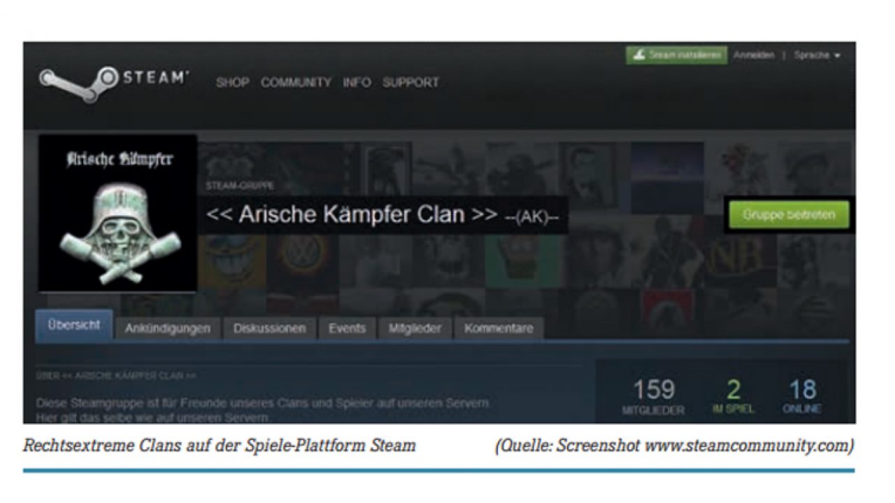 Auf der beliebten Gaming-Plattform Steam fanden sich mehrere Clans, also Zusammenschlüsse von Spieler_innen, und Einzelprofile, die sich offen rechtsextrem positionierten. Darunter einige mit deutlich politischem Bekenntnis mit Namen wie »wir wählen NPD« oder »arischer Kämpfer Clan«, aber auch sprechende Profilnamen aus Vor- und Nachname, wie z.B. »Chris Tallnacht«, die auf eine Verherrlichung des NS abzielen. Glücklicherweise sind solche Vorkommnisse in der Masse gesehen Einzelphänomene, so dass rechte Kräfte im Gegensatz zu den sehr erfolgreichen Kampagnen der NPD und neurechten Gruppierungen auf Facebook hier noch keine relevante Wirkung erzielen konnten.